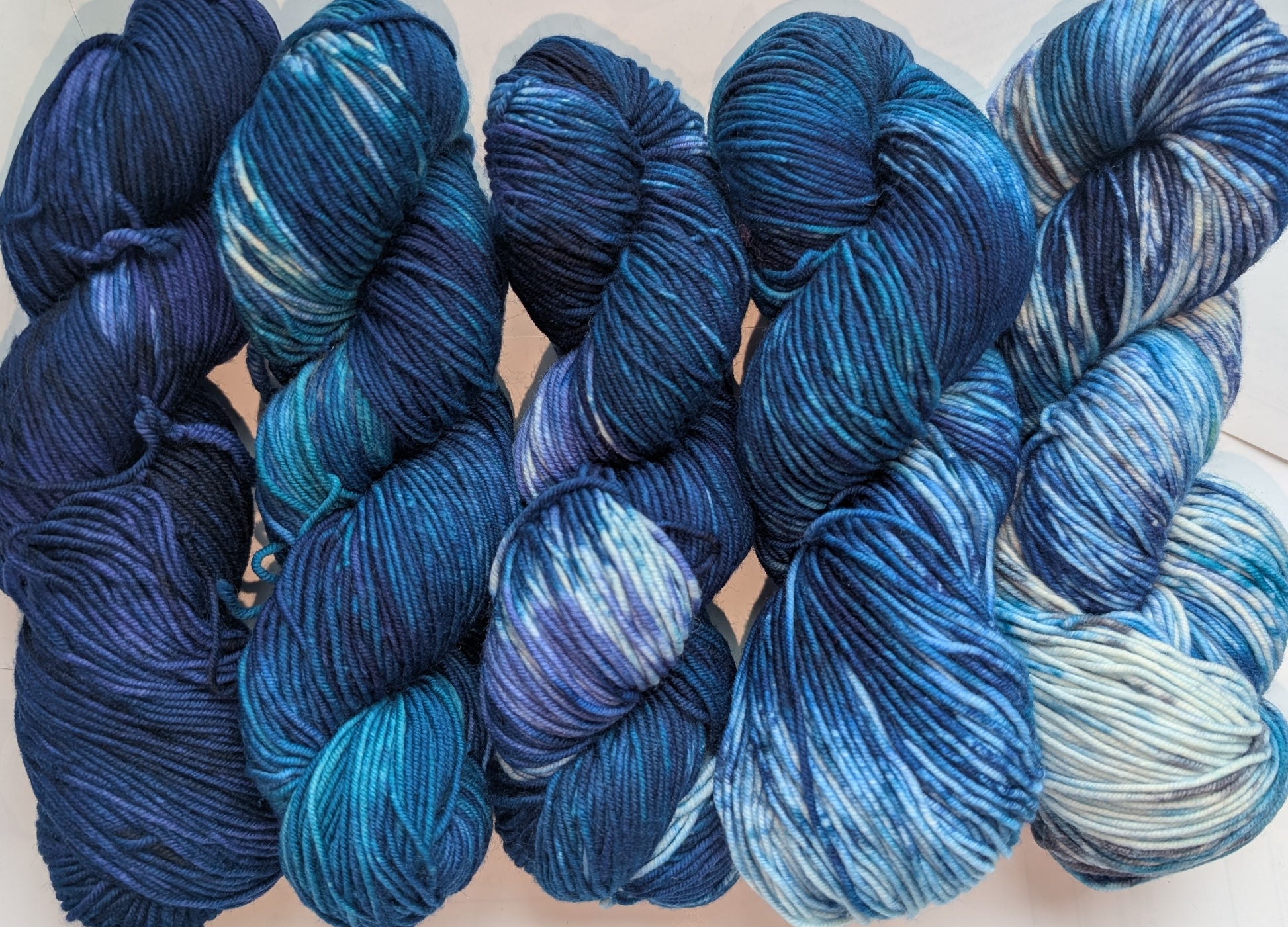 Five of your favorite skeins of yarn dyed in the colorway Iceberg at Night for maximum color coordination