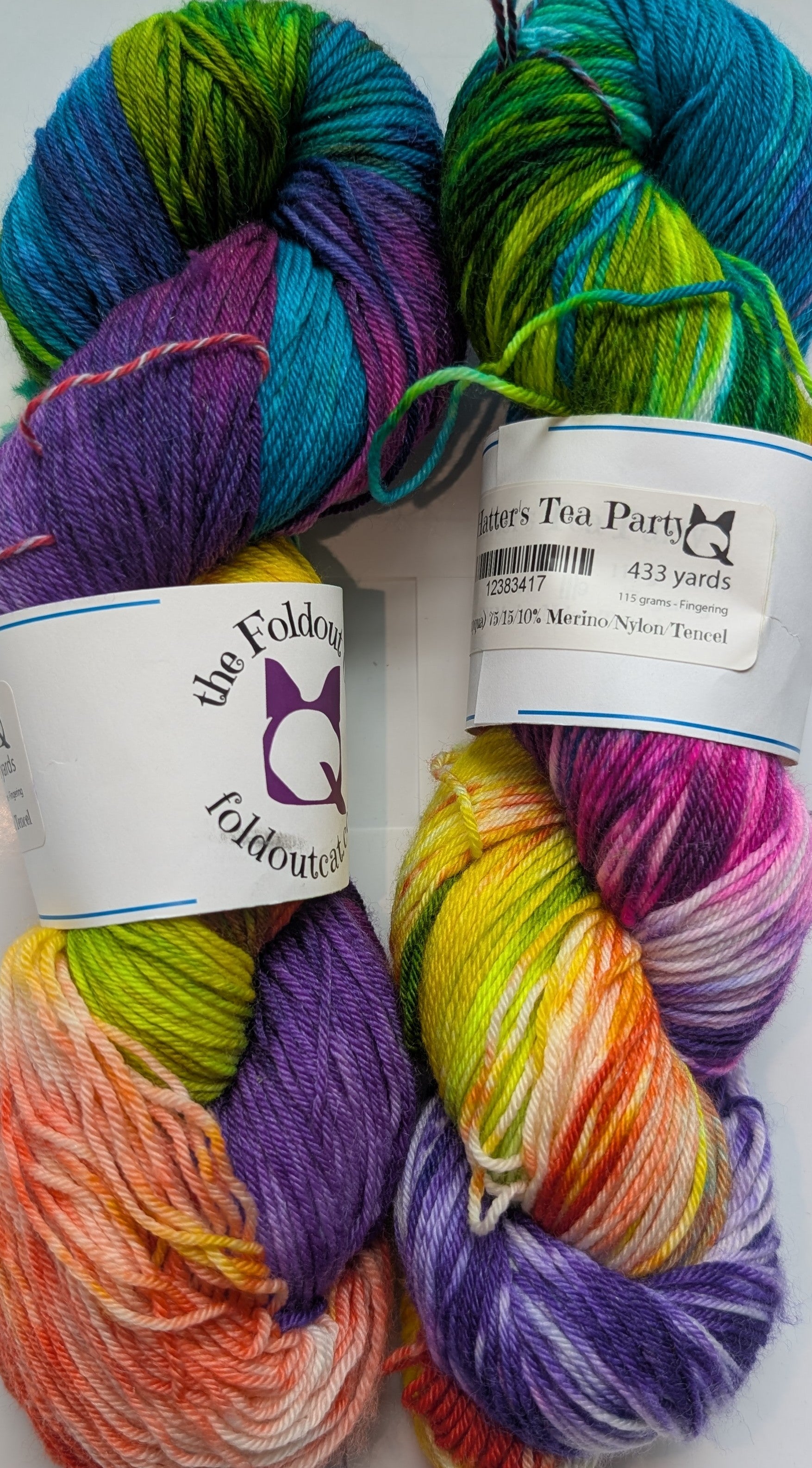 Your favorite skeins of yarn dyed in the colorway Mad Hatter's Tea Party